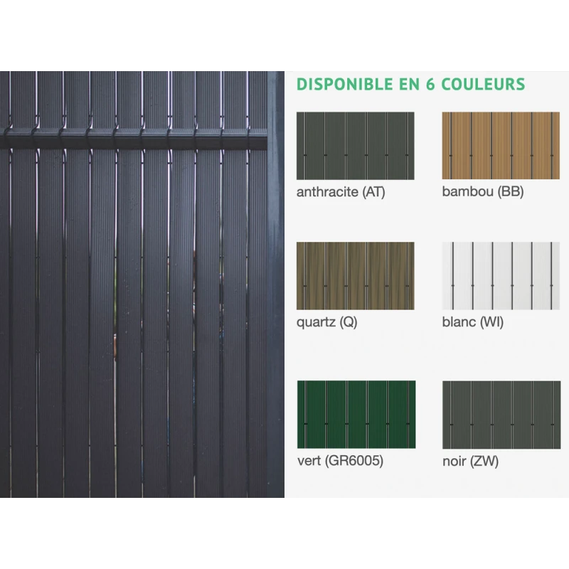 Conçues pour supporter des températures allant de -20°C à +40°C, les lamelles en PVC du kit d’occultation GMP dureront dans le temps. Disponible en 6 coloris différents et de 3 hauteurs possibles, il saura s’adapter à votre jardin avec harmonie.